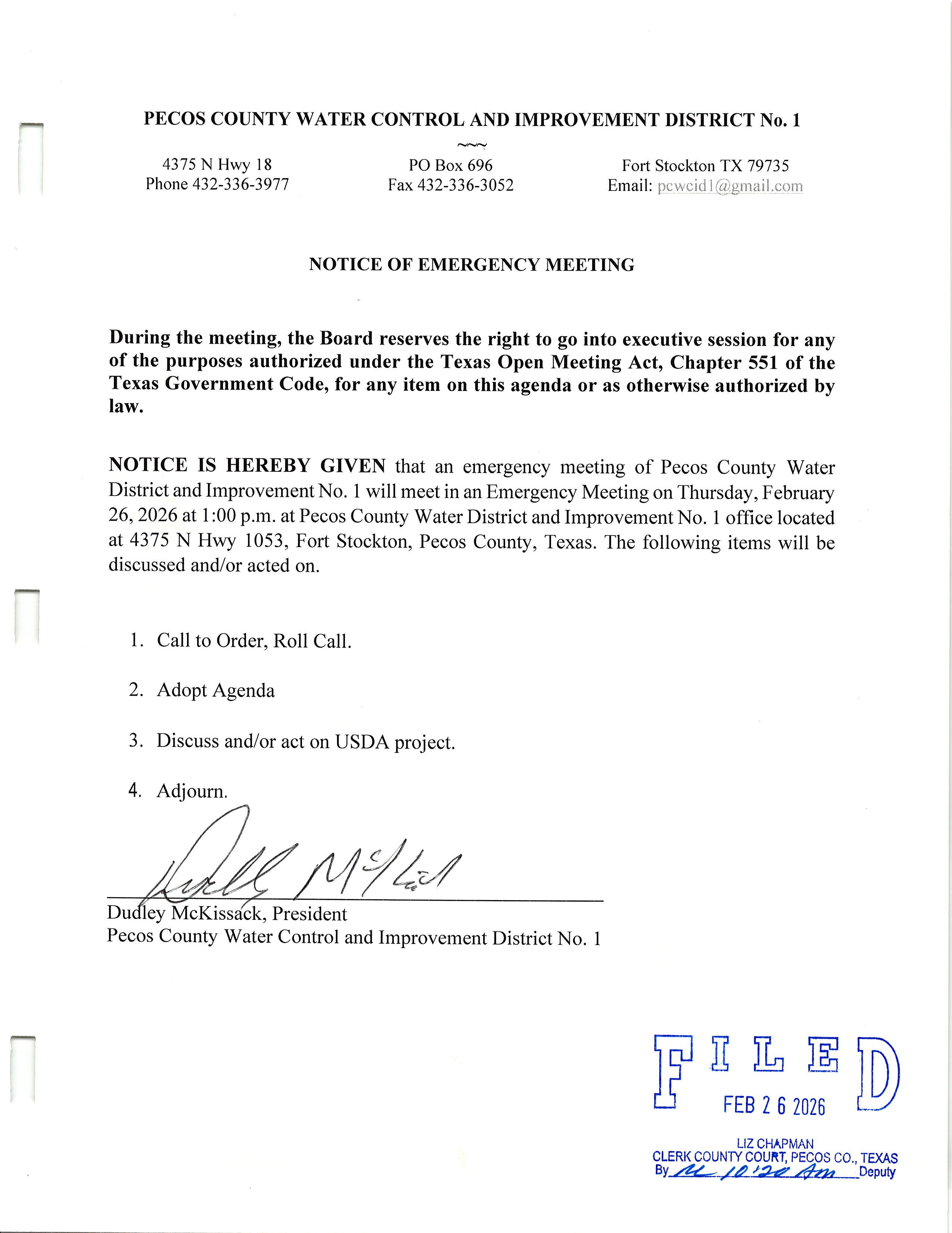 Pecos County Water Control Improvement District No. 1 agendas may be found listed below. If you are needing a document that is not available below, contact us and we will be happy to assist you.